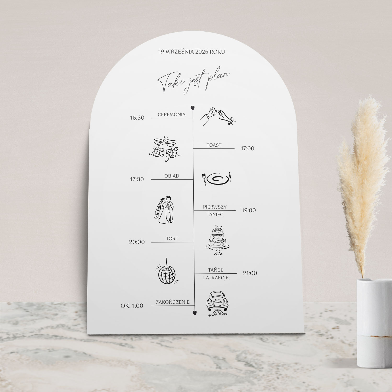 Harmonogram wesela z kolekcji Arco to plakat lub tablica, która w elegancki sposób przywita przybyłych gości i zaznajomi z planem wieczoru.. To jeden z pierwszych elementów dekoracji, który ujrzą Wasi goście, dlatego warto wybrać doskonały projekt i efektownie go wyeksponować.