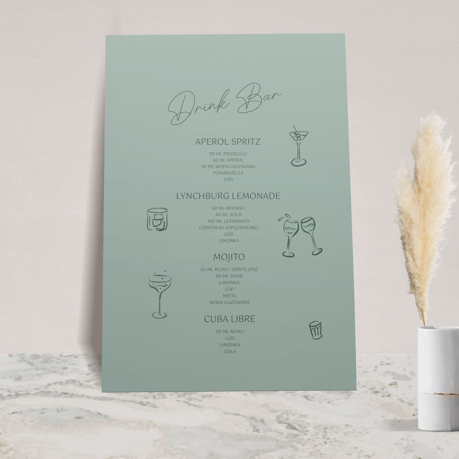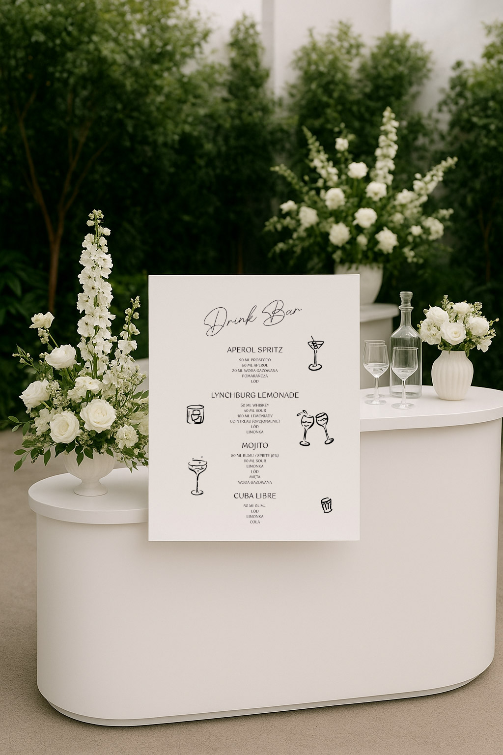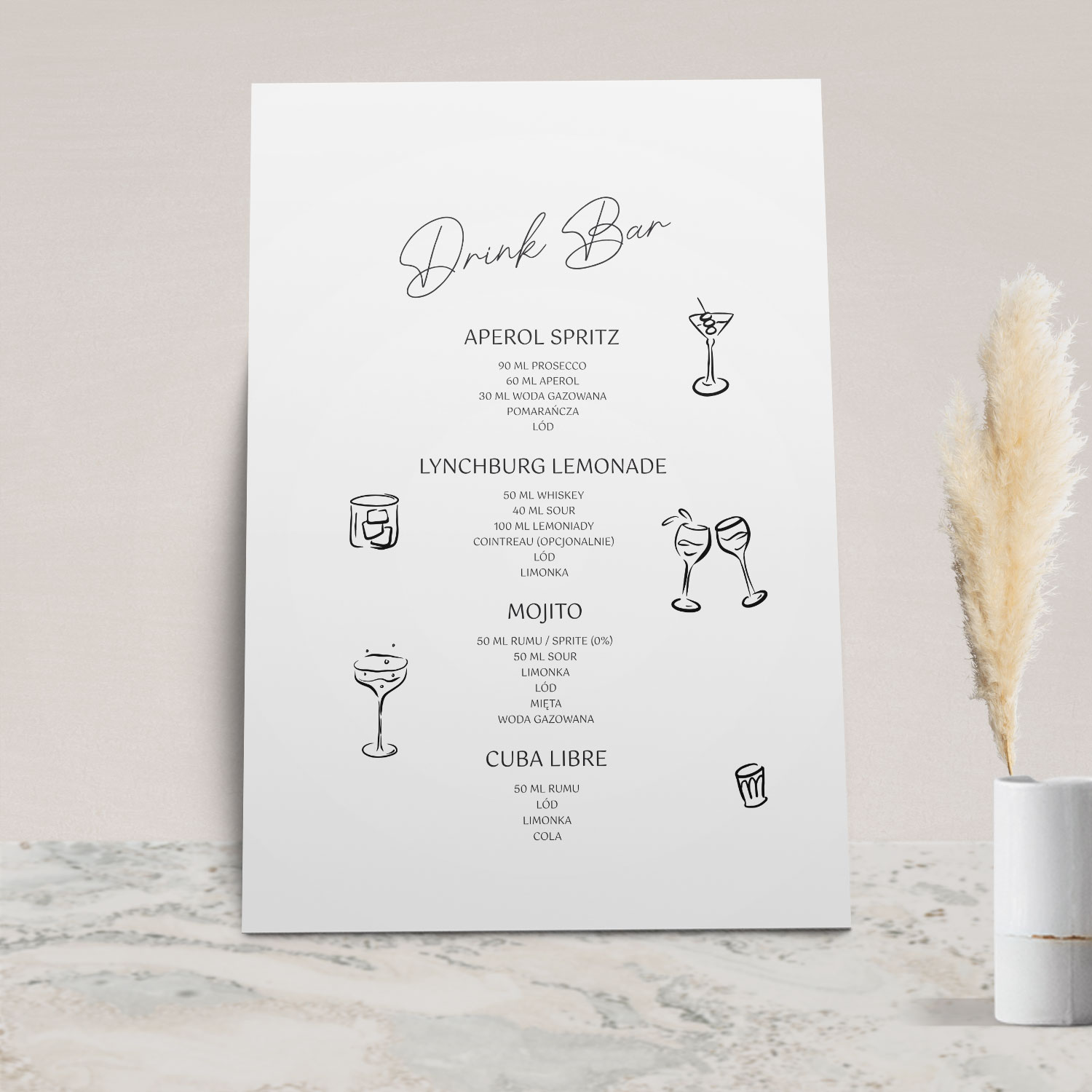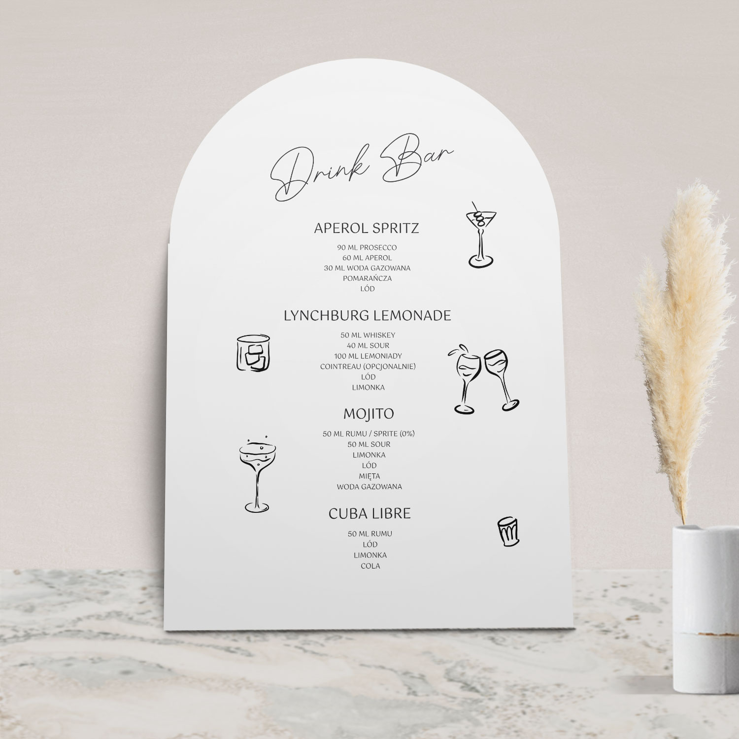 Menu drinków z kolekcji Arco to plakat lub tablica w artystycznym stylu, która w elegancki sposób zaprezentuje składy proponowanych drinków. To jeden z większych elementów papeterii, który ujrzą Wasi goście, dlatego warto wybrać doskonały projekt i efektownie go wyeksponować.