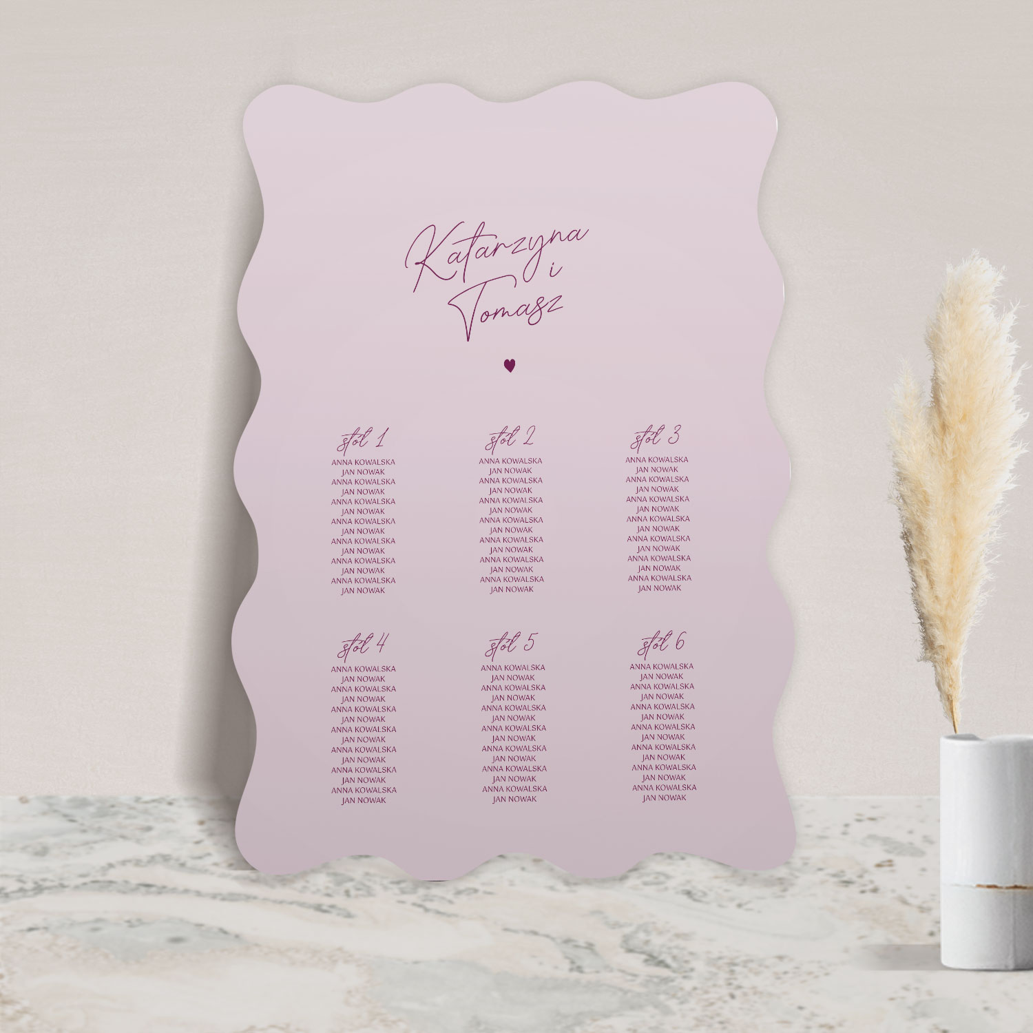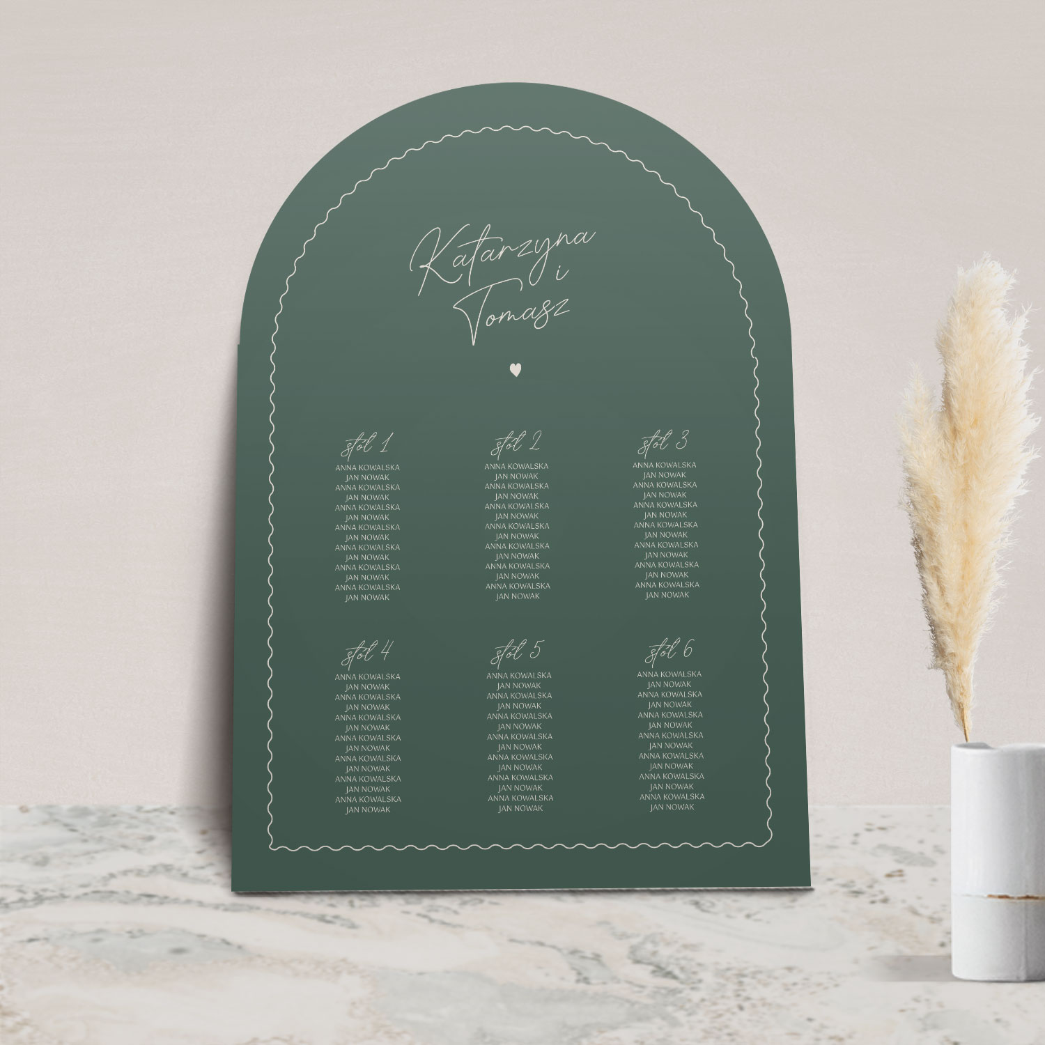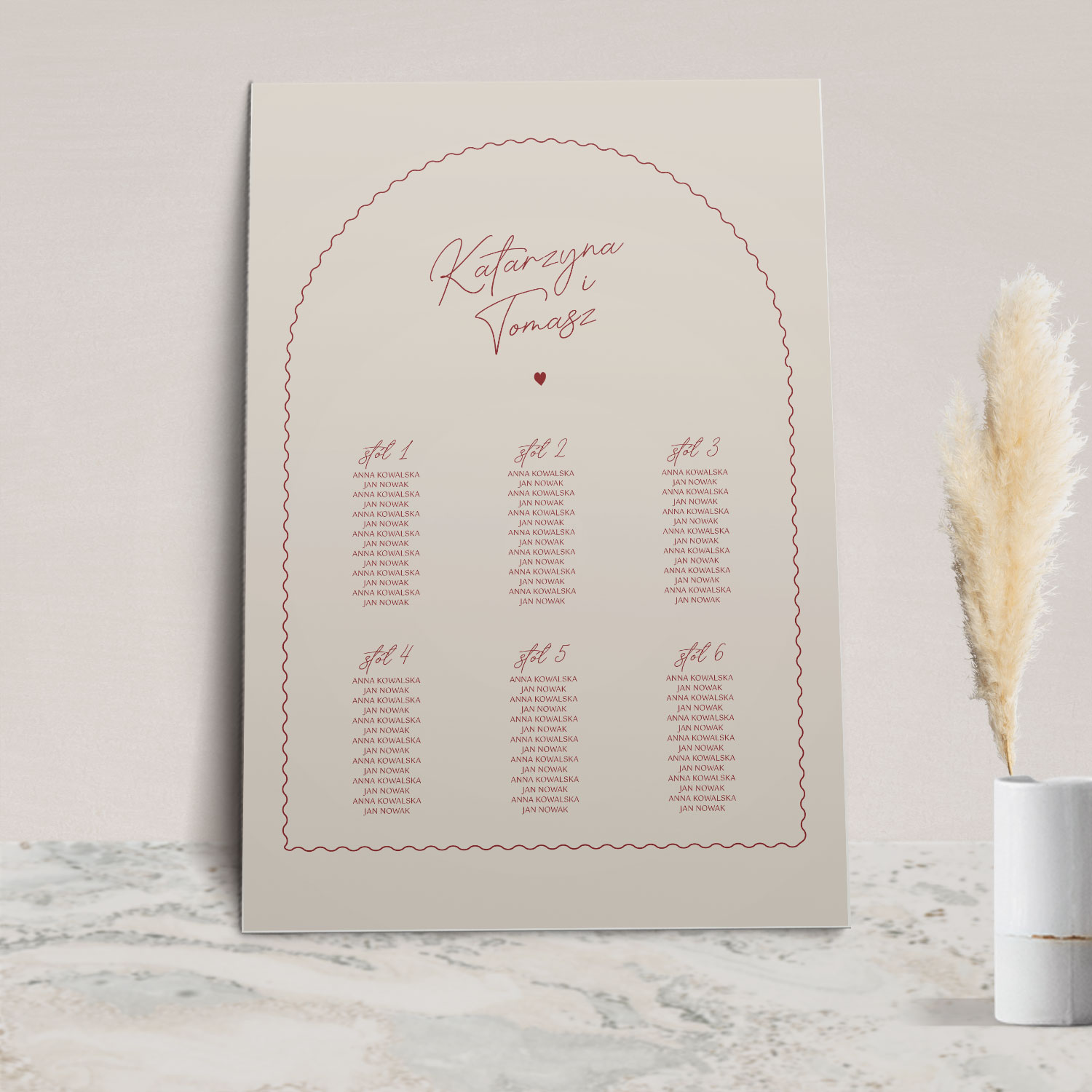 Plan stołów z kolekcji Arco to plakat lub tablica, na której znajdują się nazwiska gości weselnych wraz z numerami stołów, przy których mogą usiąść.