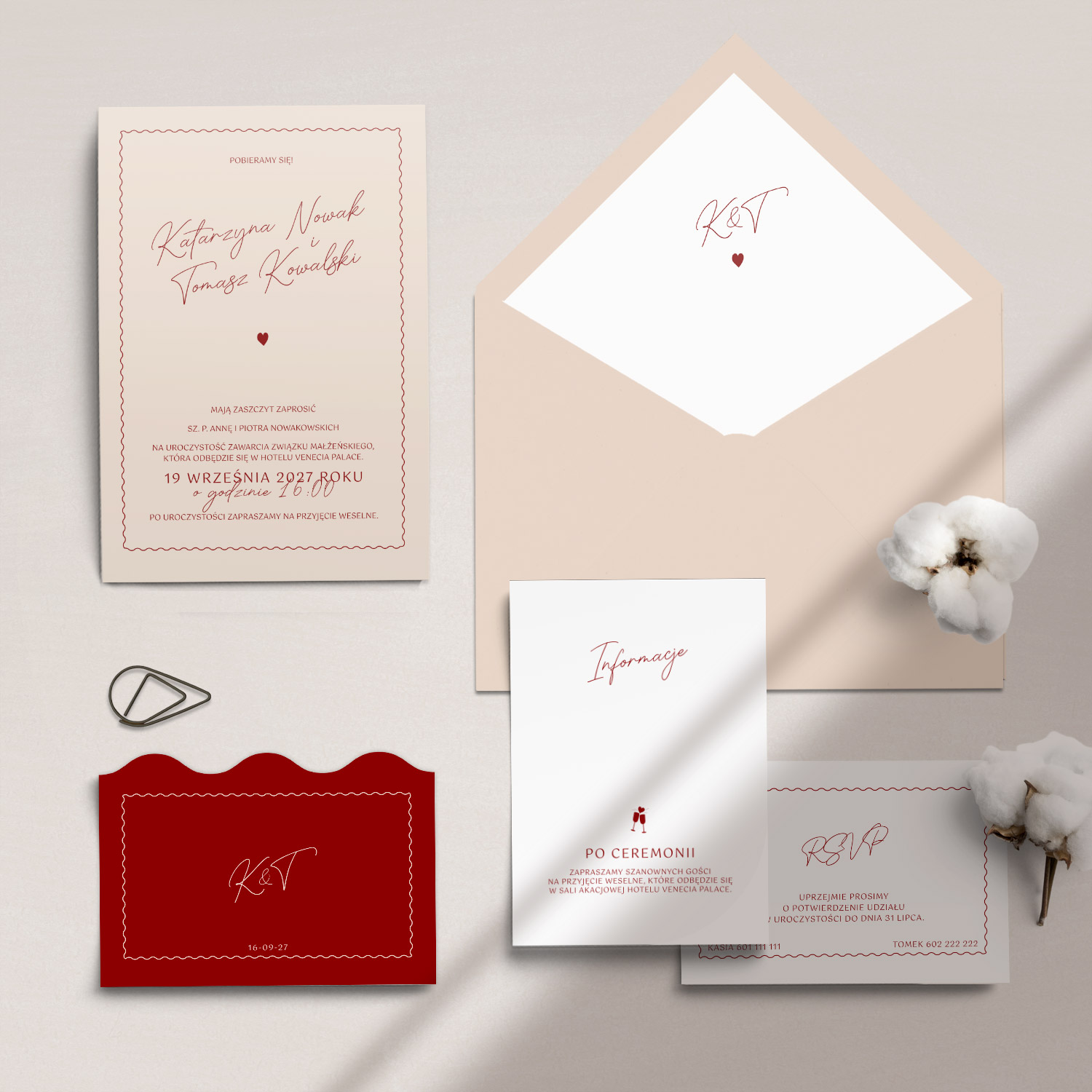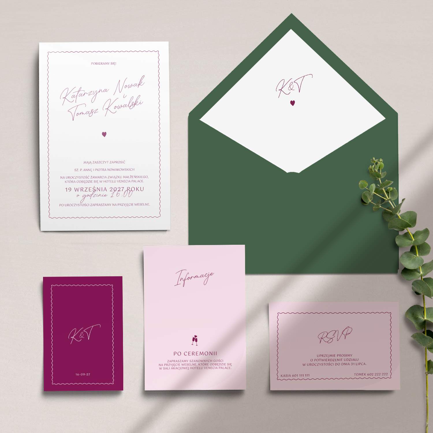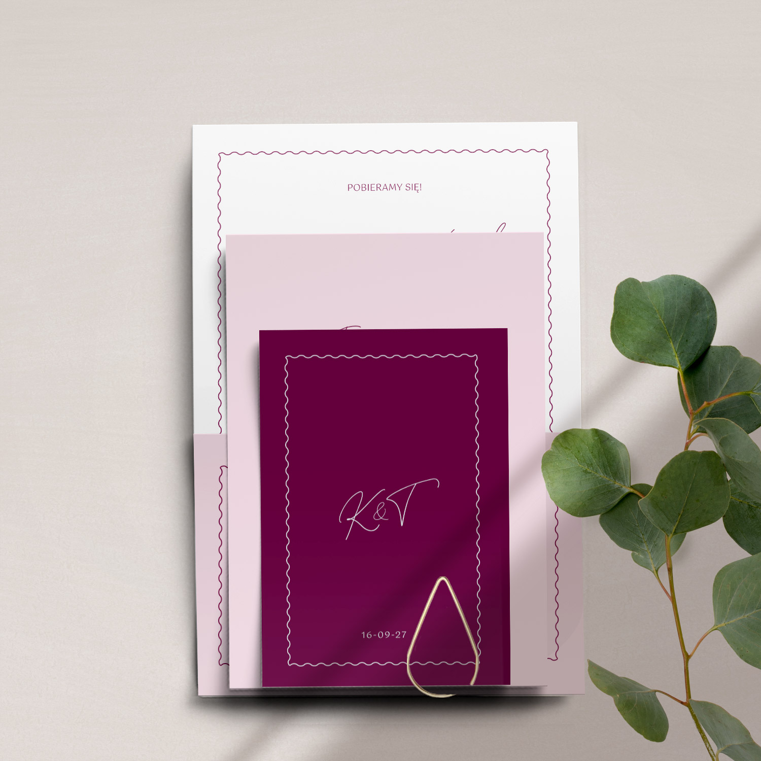 - zaproszenia ślubne oraz kompletna papeteria weselna w jednej kolekcji