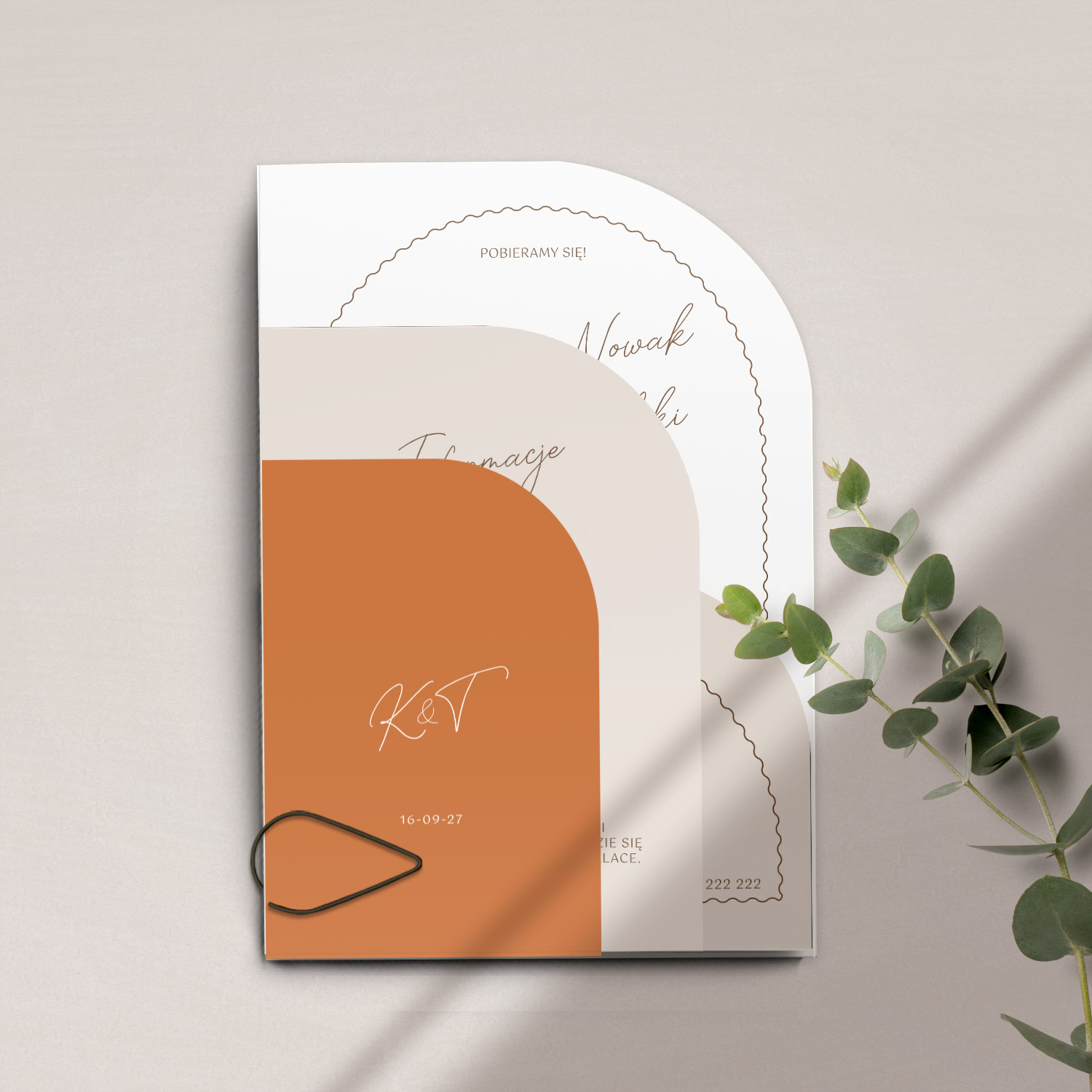 - nowoczesna papeteria ślubna inspirowana miękkimi łukami i geometrią form