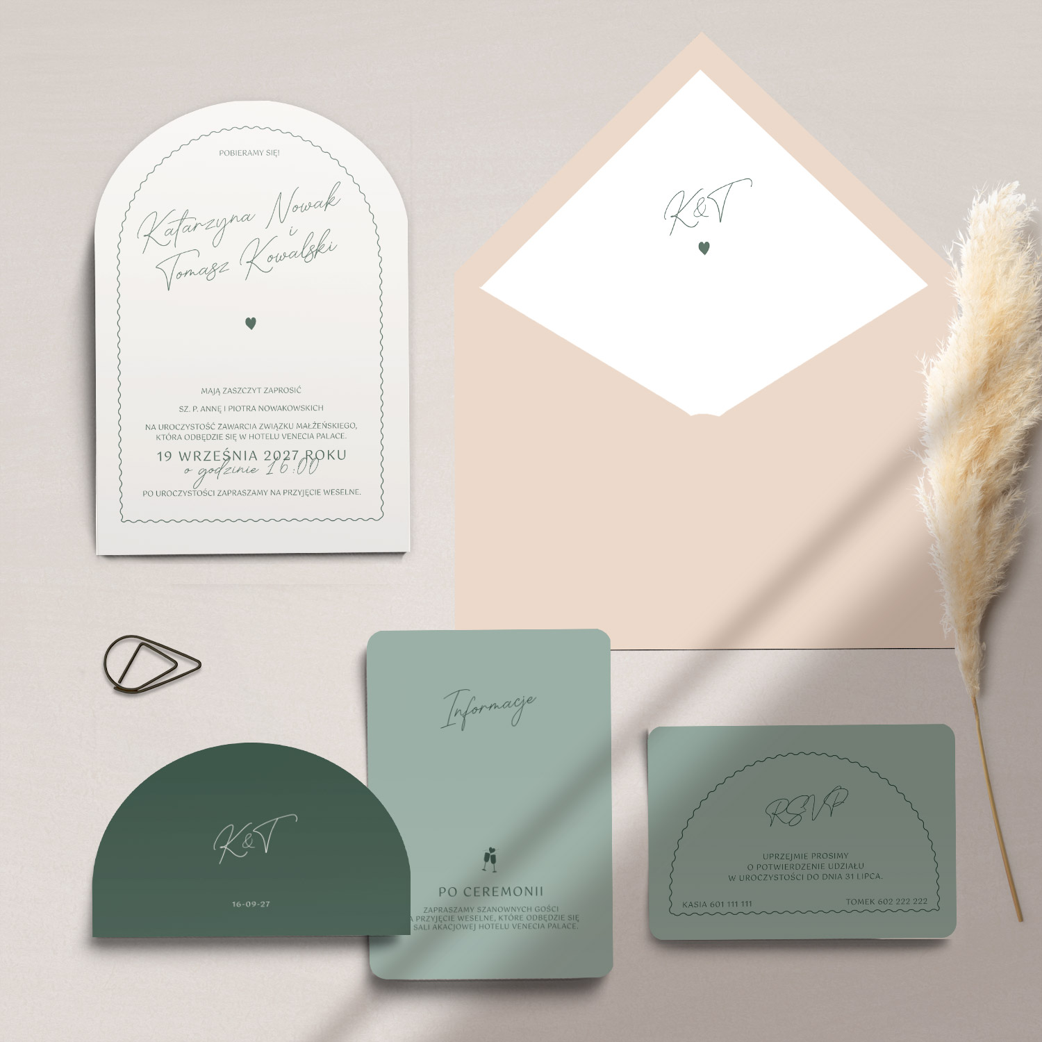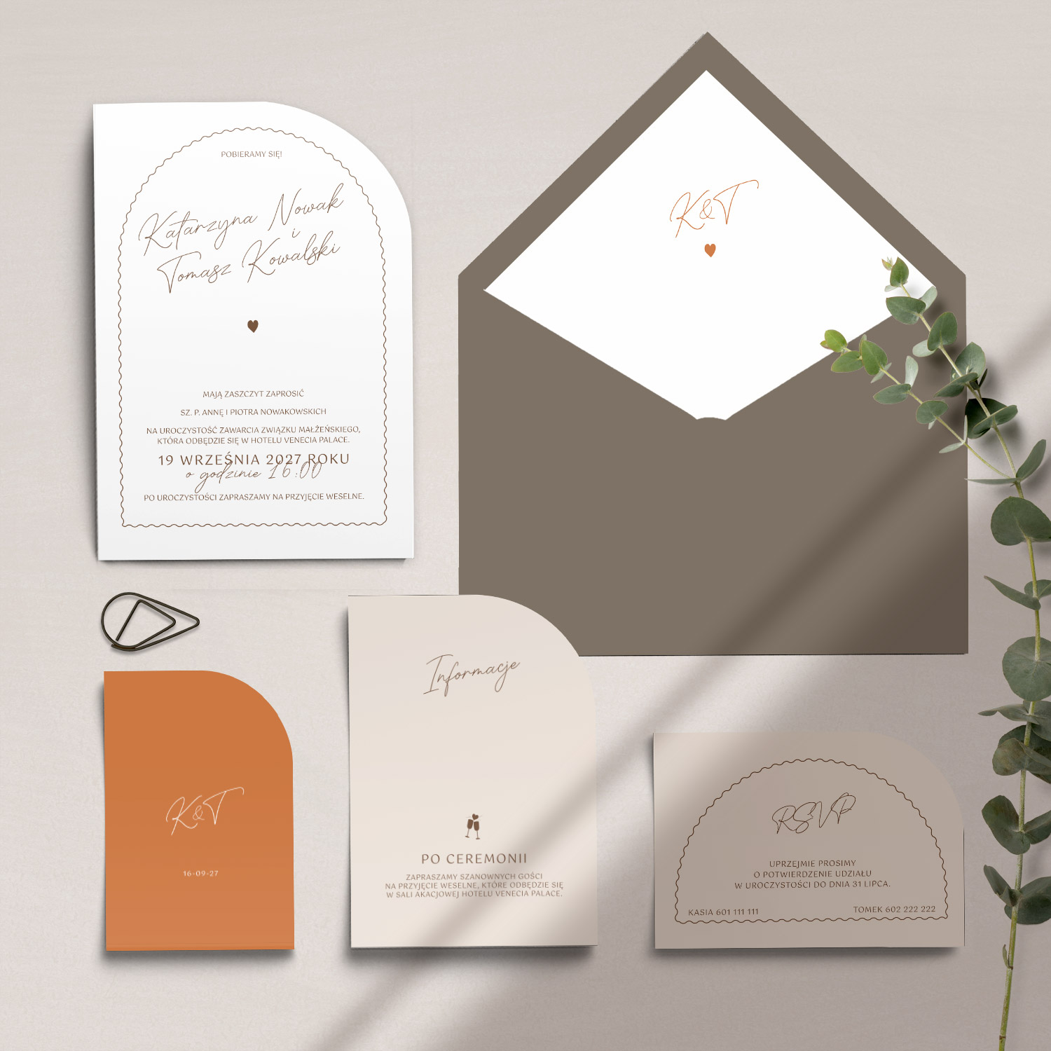 W ramach kolekcji Arco dostępne są zaproszenia ślubne oraz pełna papeteria weselna: winietki, menu weselne, zawieszki, numery stołów i inne dodatki, które pozwalają stworzyć spójną oprawę wizualną uroczystości. Każdy element kolekcji może zostać dopasowany do indywidualnych potrzeb – zarówno pod względem treści, jak i kolorystyki.