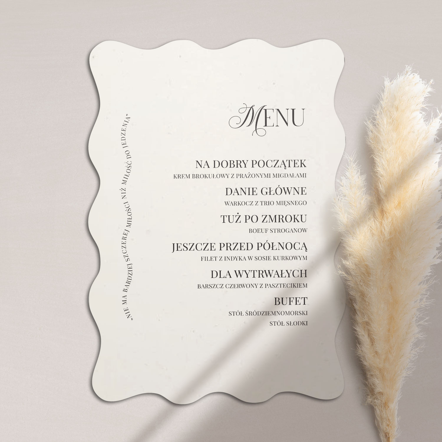 Menu ślubne z kolekcji Wave to karty dań w nowoczesnym, artystycznym stylu. Idealne dla wielu stylizacji od klasycznych po romantyczne.